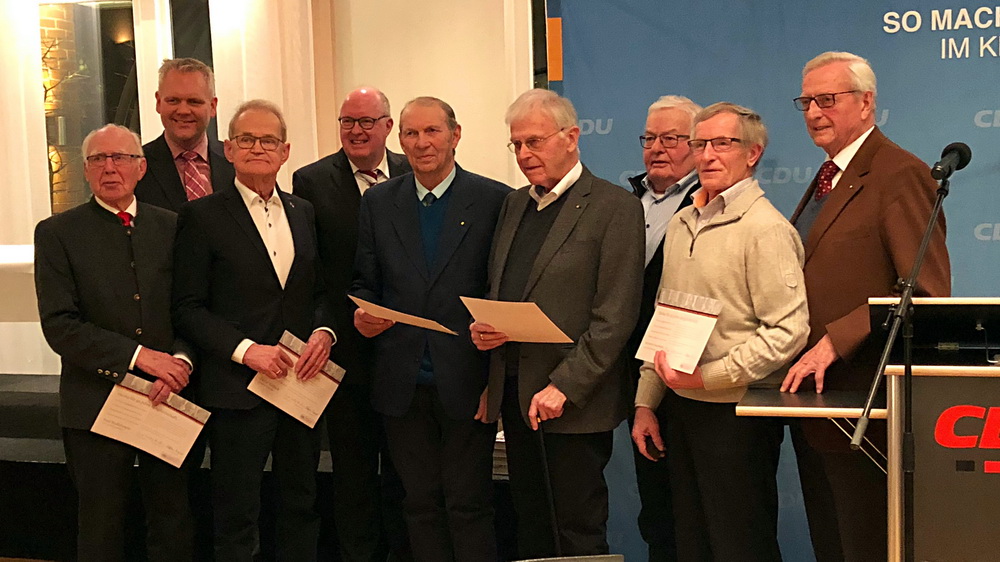 v. links: Paul Rießelmann; Björn Thümler (MdL); Günther Südbeck; Stefan Siemer (MdL); Josef Warnking; Bernhard Wienhold; Georg Strieker; Karl-Heinz Oevermann; Clemens-August Krapp Aus gesundheitlichen oder terminlichen Gründen konnten folgende Jubilare leider nicht dabei sein: Josef Berkemeyer und Georg Hermes, beide 60 Jahre.50 jährige Jubilare Hans Schlotmann, Jürgen Fortmann, Egon Müller, Thea Rüve, Hanna Buschmann, Dr. Hubert Kreuzkamp, Heinz Witte, Josef Pulsfort, Johannes Kröger, Robert Bödeker, Heinrich Rechtien, Bernhard Schröder, Herr Gieseke, August Wüllner, Hermann Fries, Heinz Blömer, Herrmann Reinke, Eduard Langeland, Engelbert Frilling, Norbert Bünker, Heinrich Wilking, Franz Grave und Bernhard Többe-Bultmann. Der Minister blickte in seiner Rede auf die konstruktive Koalitionsbildung in Niedersachsen zurück, die, ganz im Gegensatz zu den Verhandlungen in Berlin, schnell und geräuschlos vonstatten ging. Der Uni Vechta versprach er mehr Mittel und er machte deutlich das Er gewillt sei, die neue Landesregierung zum Erfolg zu führen. Das Programm wurde, durch Auftritte der DERSA-Highlanders und durch den Besuch des Carnevalprinzen Thomas Lübbehusen mit seinem kompletten Hofstaat, abgerundet.
